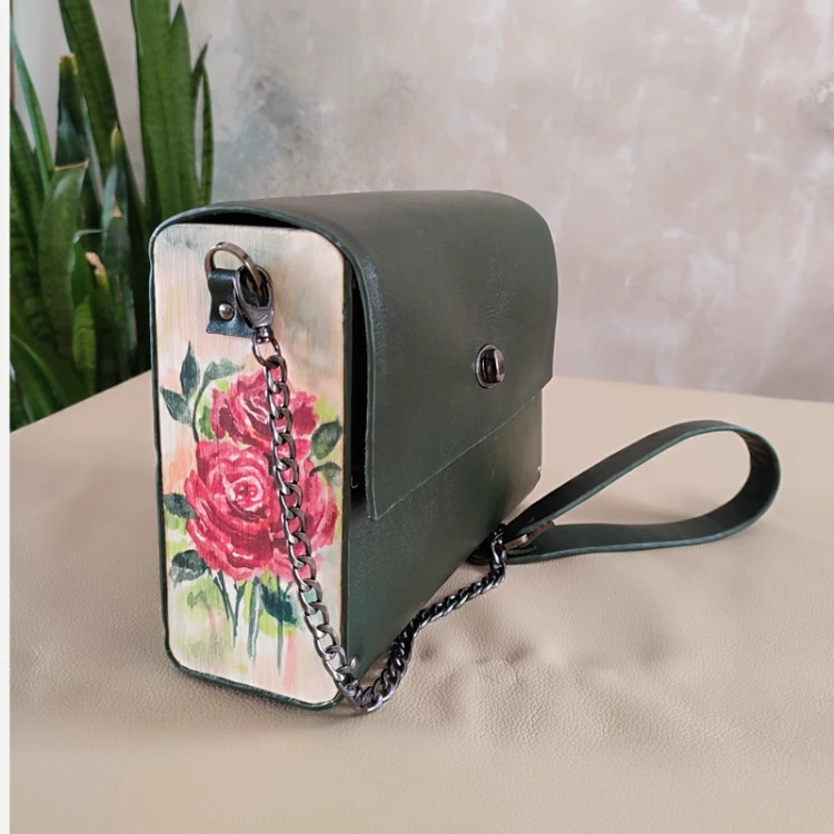 کیف رودوشی زنانه طرح رز چرم طبیعی گاوی درجه یک تماما دستدوز است که در کناره کیف از چوب نراد طراحی شده توسط تیم چرم خلاق استفاده شده که روی چوب ها نقاشی دست با رنگ آکرولیک کار شده و تمامی چوب ها دارای پوشش نانو ضد آب و خش است.