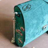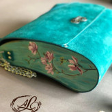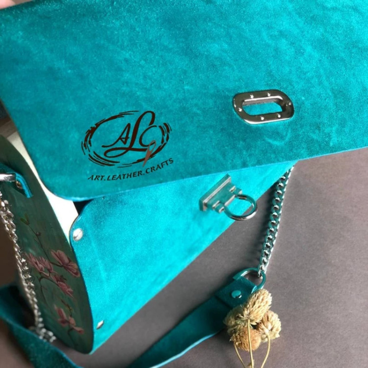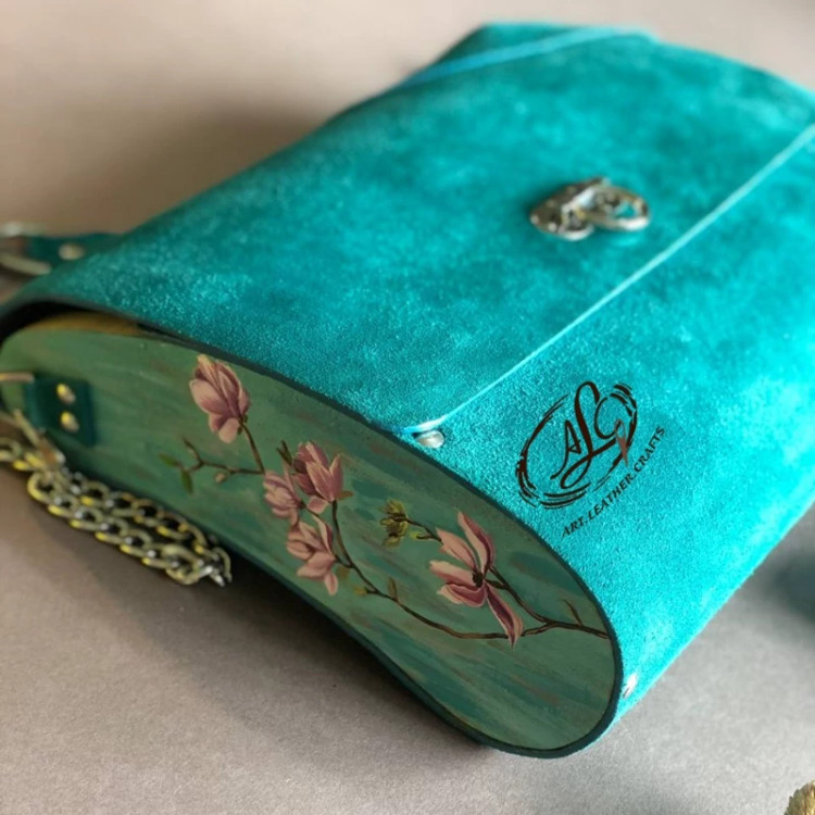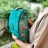 کیف رودوشی زنانه طرح گل یاس چرم طبیعی گاوی درجه یک تماما دستدوز است که در کناره کیف از چوب نراد طراحی شده توسط تیم چرم خلاق استفاده شده که روی چوب ها نقاشی دست با رنگ آکرولیک کار شده و تمامی چوب ها دارای پوشش نانو ضد آب و خش است.