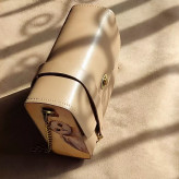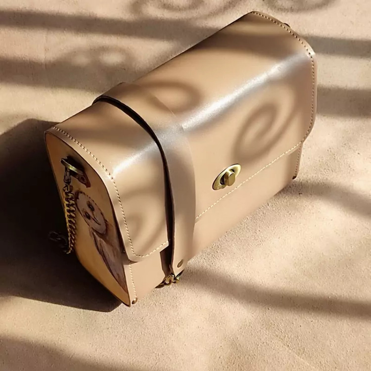 کیف رودوشی طرح جغد چرم طبیعی گاوی درجه یک تماما دستدوز است که در کناره کیف از چوب نراد طراحی شده توسط تیم چرم خلاق استفاده شده که روی چوب ها نقاشی دست با رنگ آکرولیک کار شده و تمامی چوب ها دارای پوشش نانو ضد آب و خش است.