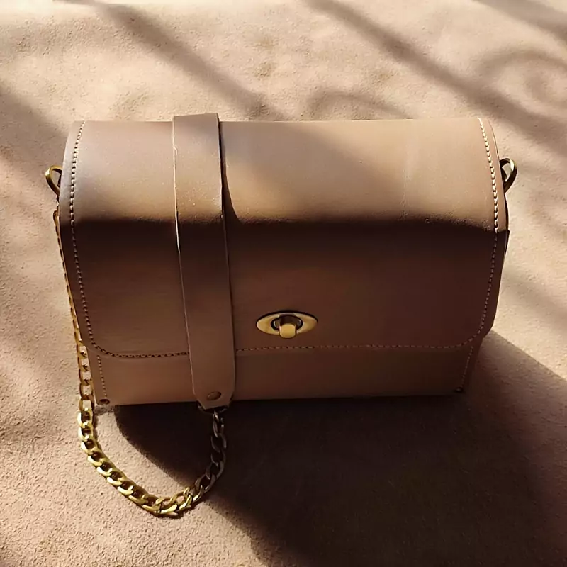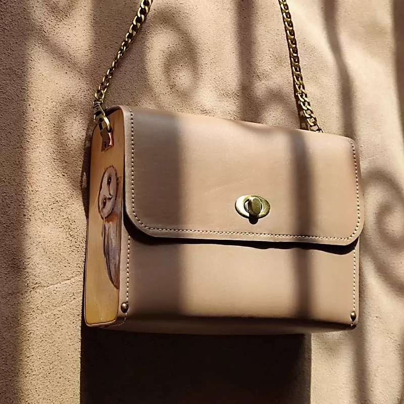 کیف رودوشی طرح جغد چرم طبیعی گاوی درجه یک تماما دستدوز است که در کناره کیف از چوب نراد طراحی شده توسط تیم چرم خلاق استفاده شده که روی چوب ها نقاشی دست با رنگ آکرولیک کار شده و تمامی چوب ها دارای پوشش نانو ضد آب و خش است.