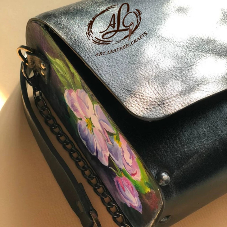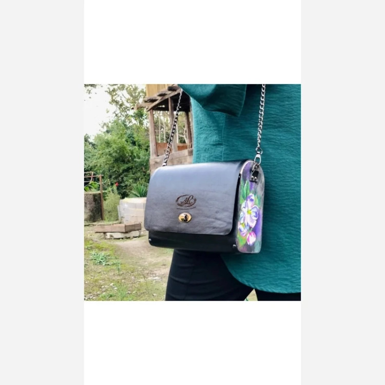 کیف رودوشی زنانه طرح گل بنفشه چرم طبیعی گاوی درجه یک تماما دستدوز است که در کناره کیف از چوب نراد طراحی شده توسط تیم چرم خلاق استفاده شده که روی چوب ها نقاشی دست با رنگ آکرولیک کار شده و تمامی چوب ها دارای پوشش نانو ضد آب و خش است.