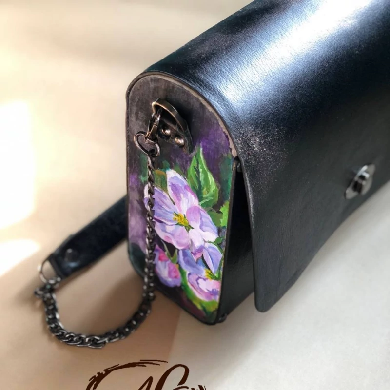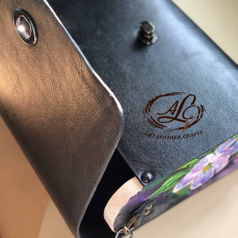 کیف رودوشی زنانه طرح گل بنفشه چرم طبیعی گاوی درجه یک تماما دستدوز است که در کناره کیف از چوب نراد طراحی شده توسط تیم چرم خلاق استفاده شده که روی چوب ها نقاشی دست با رنگ آکرولیک کار شده و تمامی چوب ها دارای پوشش نانو ضد آب و خش است.