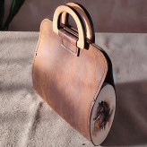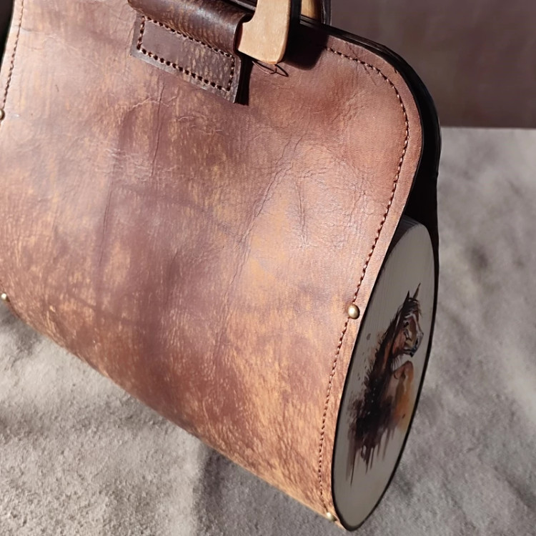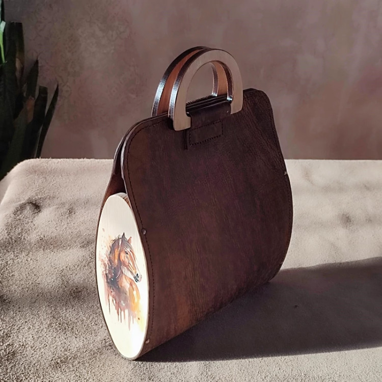 کیف دسته چوبی زنانه طرح اسب چرم طبیعی گاوی درجه یک تماما دستدوز است که در کناره کیف از چوب نراد طراحی شده توسط تیم چرم خلاق استفاده شده که روی چوب ها نقاشی دست با رنگ آکرولیک کار شده و تمامی چوب ها دارای پوشش نانو ضد آب و خش است.