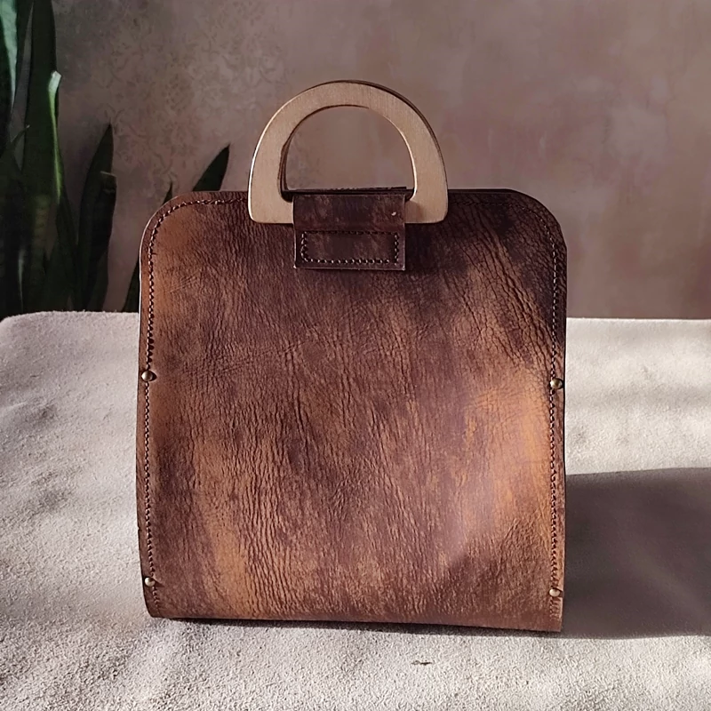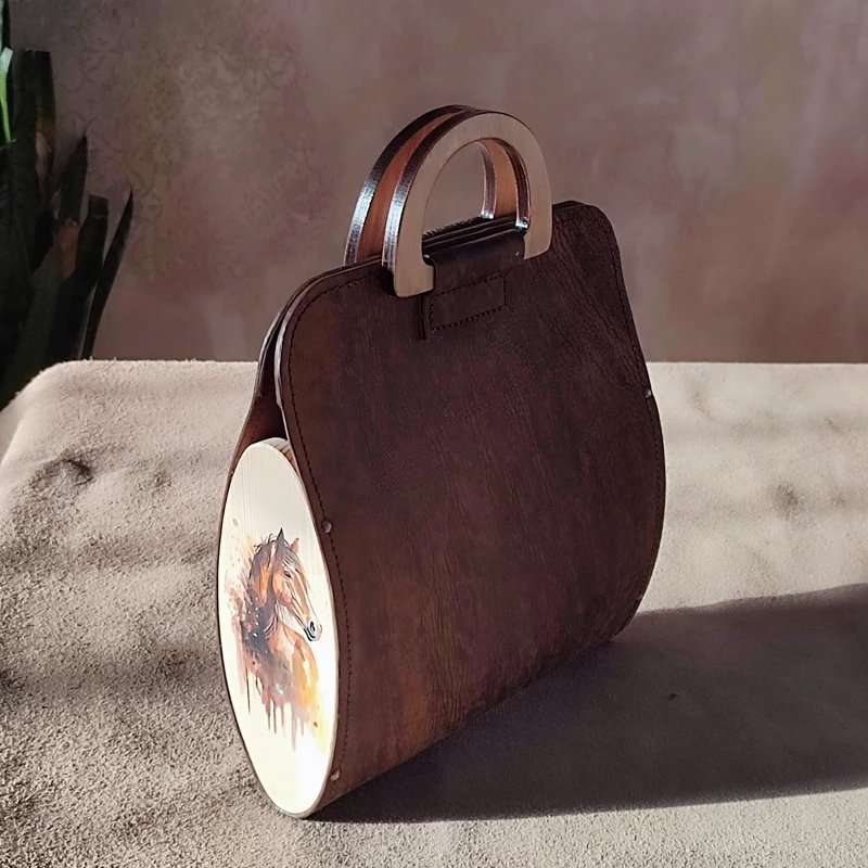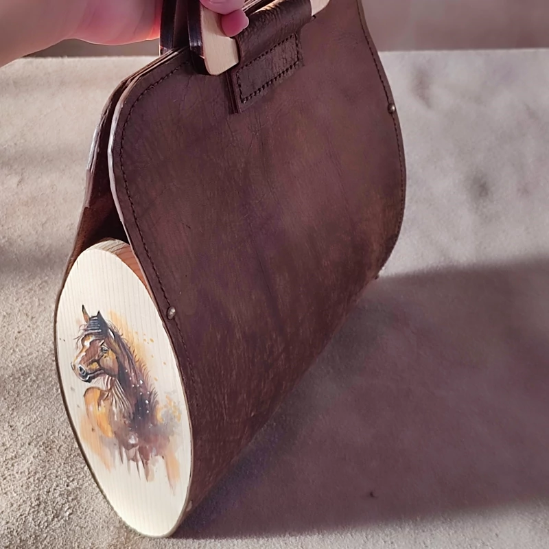 کیف دسته چوبی زنانه طرح اسب چرم طبیعی گاوی درجه یک تماما دستدوز است که در کناره کیف از چوب نراد طراحی شده توسط تیم چرم خلاق استفاده شده که روی چوب ها نقاشی دست با رنگ آکرولیک کار شده و تمامی چوب ها دارای پوشش نانو ضد آب و خش است.