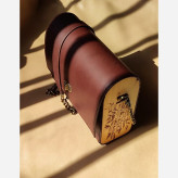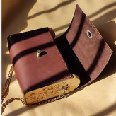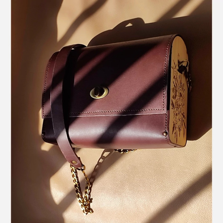 کیف رودوشی زنانه طرح گل و پروانه چرم طبیعی گاوی درجه یک تماما دستدوز است که در کناره کیف از چوب نراد طراحی شده توسط تیم چرم خلاق استفاده شده که روی چوب ها سوخته نگاری شده و تمامی چوب ها دارای پوشش نانو ضد آب و خش است.