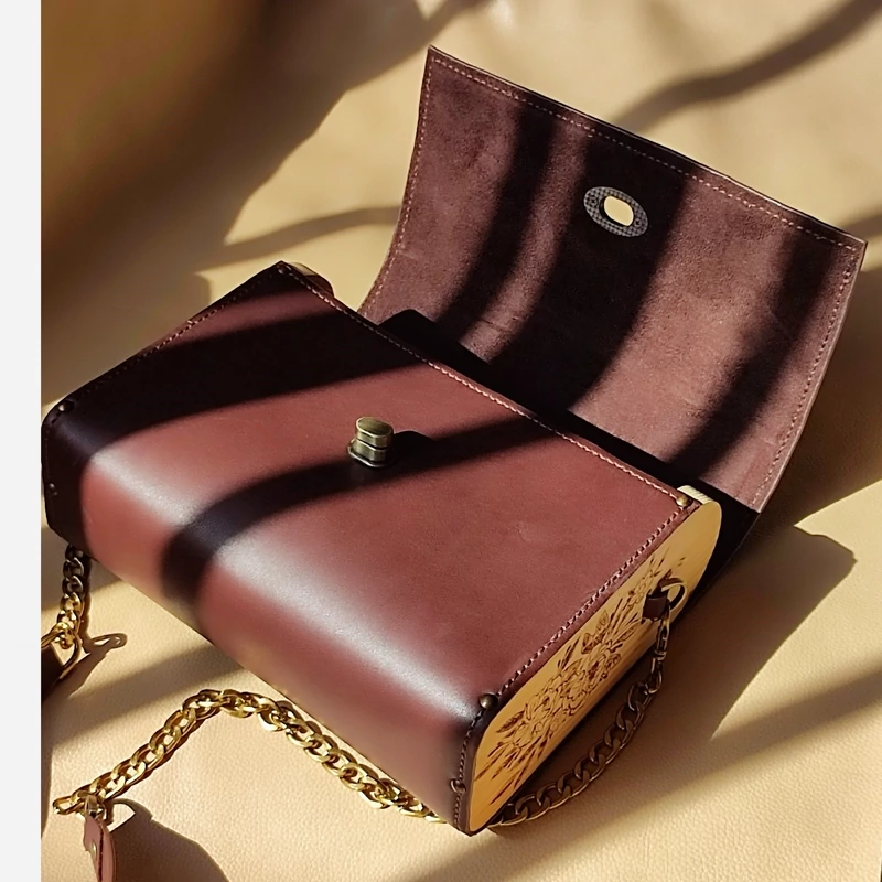کیف رودوشی زنانه طرح گل و پروانه چرم طبیعی گاوی درجه یک تماما دستدوز است که در کناره کیف از چوب نراد طراحی شده توسط تیم چرم خلاق استفاده شده که روی چوب ها سوخته نگاری شده و تمامی چوب ها دارای پوشش نانو ضد آب و خش است.