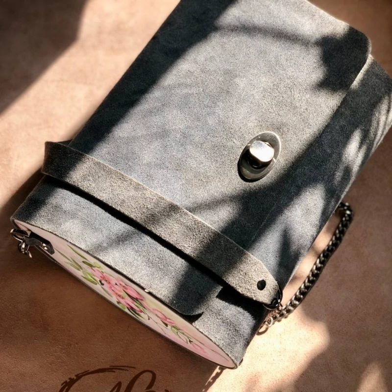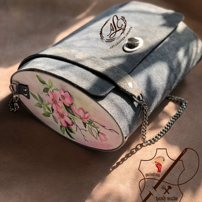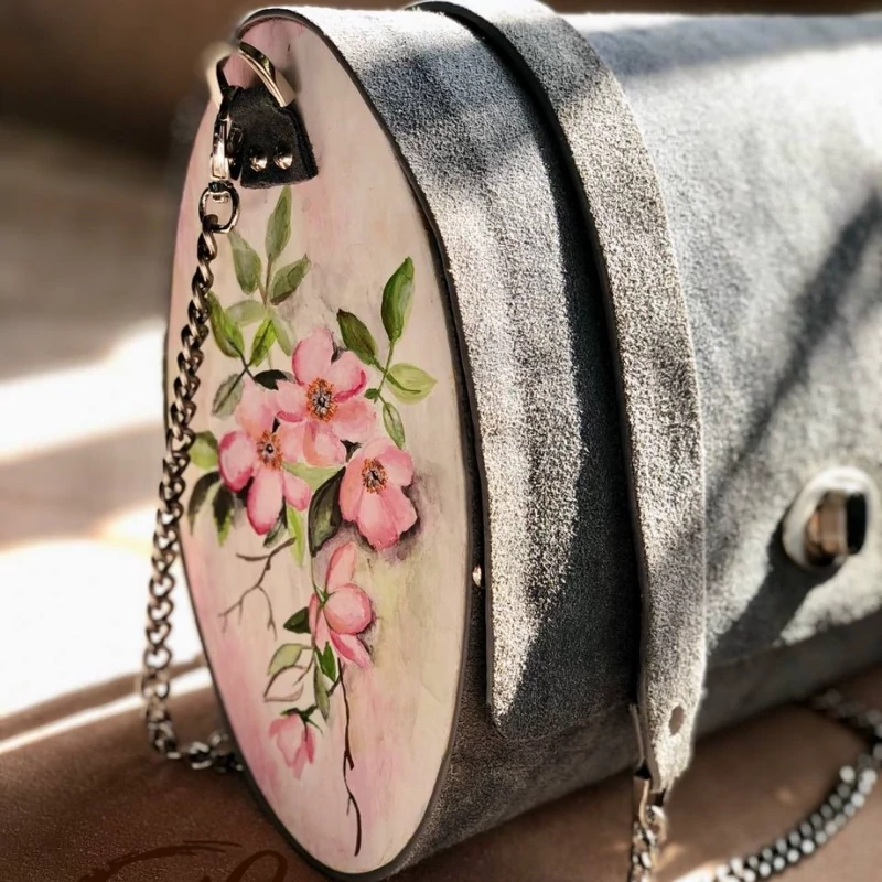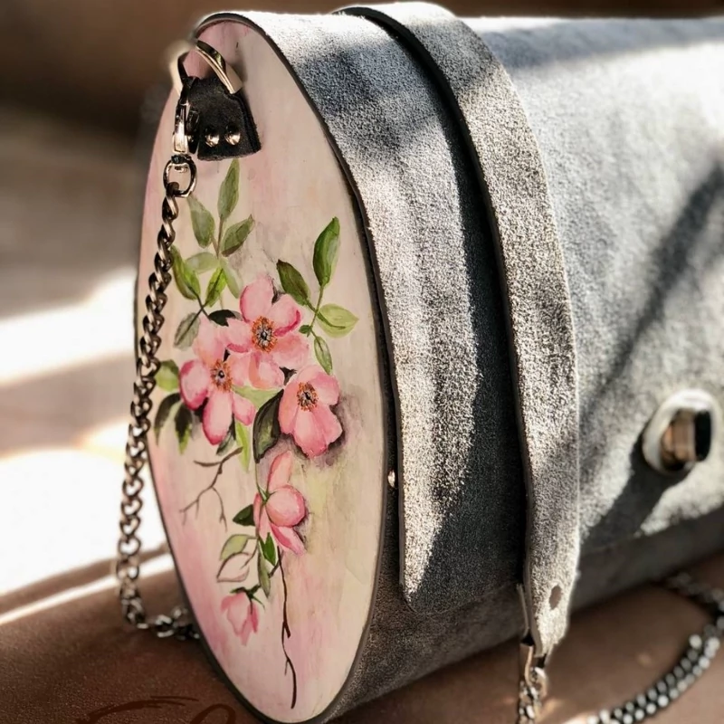 کیف رودوشی زنانه طرح کاملیا چرم طبیعی گاوی درجه یک تماما دستدوز است که در کناره کیف از چوب نراد طراحی شده توسط تیم چرم خلاق استفاده شده که روی چوب ها نقاشی دست با رنگ آکرولیک کار شده و تمامی چوب ها دارای پوشش نانو ضد آب و خش است.
