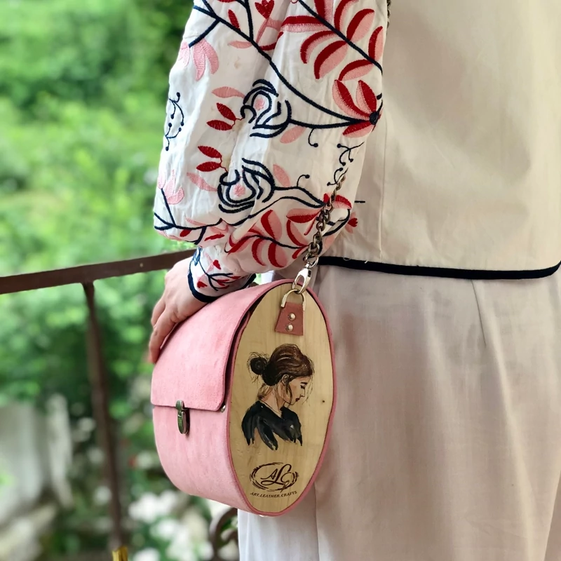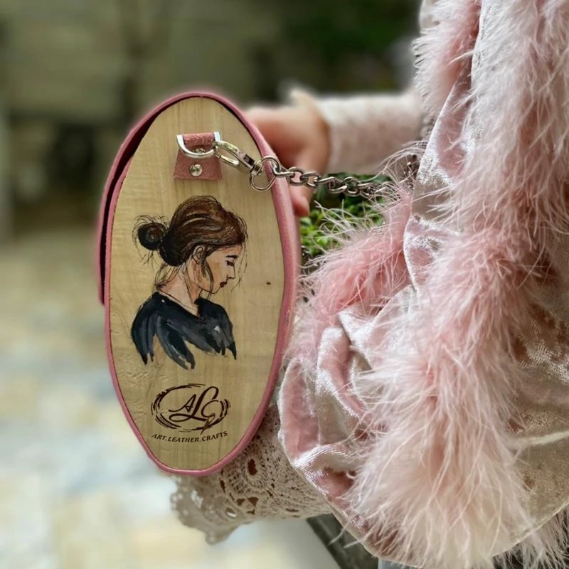 کیف رودوشی زنانه طرح نیم رخ چرم طبیعی گاوی درجه یک تماما دستدوز است که در کناره کیف از چوب نراد طراحی شده توسط تیم چرم خلاق استفاده شده که روی چوب ها نقاشی دست با رنگ آکرولیک کار شده و تمامی چوب ها دارای پوشش نانو ضد آب و خش است.