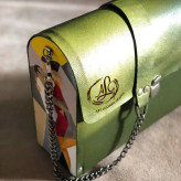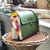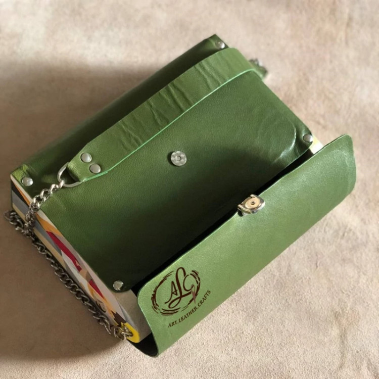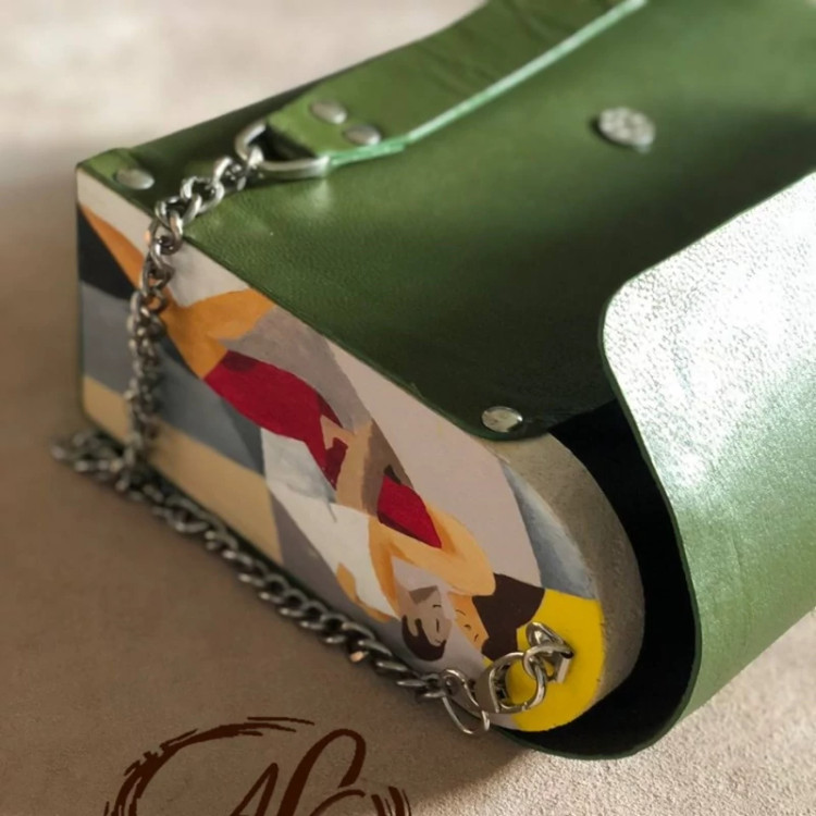 کیف رودوشی زنانه طرح کوبیسم آغوش چرم طبیعی گاوی درجه یک تماما دستدوز است که در کناره کیف از چوب نراد طراحی شده توسط تیم چرم خلاق استفاده شده که روی چوب ها نقاشی دست با رنگ آکرولیک کار شده و تمامی چوب ها دارای پوشش نانو ضد آب و خش است.