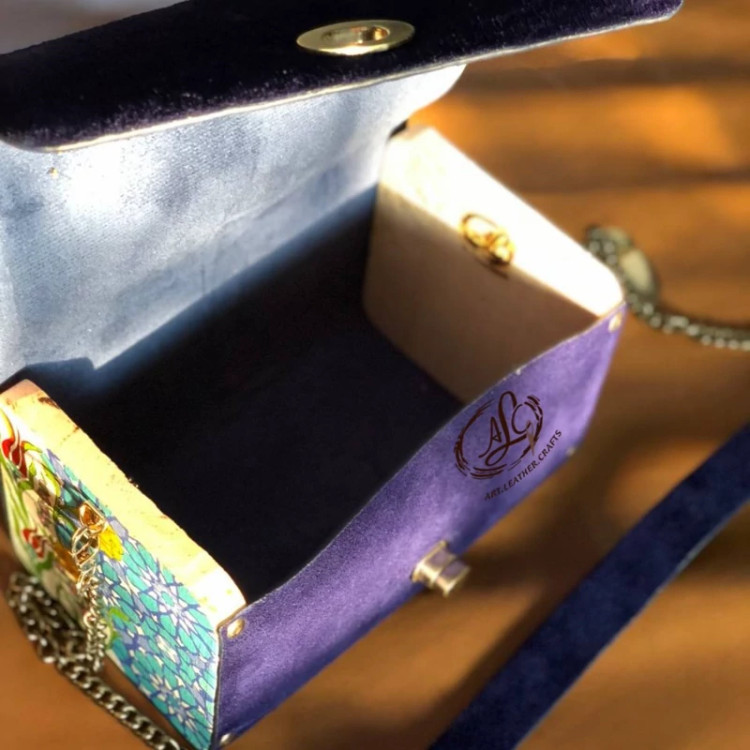 کیف رودوشی زنانه طرح گل وسنت با قابلیت اضافه کردن بند دستی چرم طبیعی گاوی درجه یک تماما دستدوز است که در کناره کیف از چوب نراد طراحی شده توسط تیم چرم خلاق استفاده شده که روی چوب ها نقاشی دست با رنگ آکرولیک کار شده و تمامی چوب ها دارای پوشش نانو ضد آب و خش است.