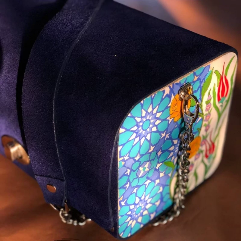 کیف رودوشی زنانه طرح گل وسنت با قابلیت اضافه کردن بند دستی چرم طبیعی گاوی درجه یک تماما دستدوز است که در کناره کیف از چوب نراد طراحی شده توسط تیم چرم خلاق استفاده شده که روی چوب ها نقاشی دست با رنگ آکرولیک کار شده و تمامی چوب ها دارای پوشش نانو ضد آب و خش است.