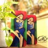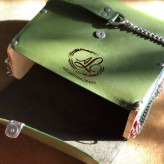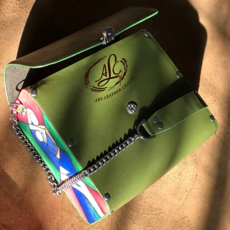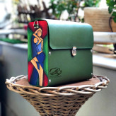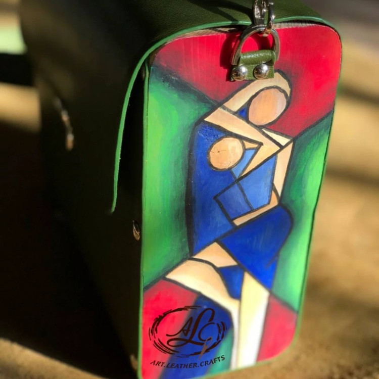 کیف رودوشی زنانه طرح کوبیسم عشق چهره چرم طبیعی گاوی درجه یک تماما دستدوز است که در کناره کیف از چوب نراد طراحی شده توسط تیم چرم خلاق استفاده شده که روی چوب ها نقاشی دست با رنگ آکرولیک کار شده و تمامی چوب ها دارای پوشش نانو ضد آب و خش است.