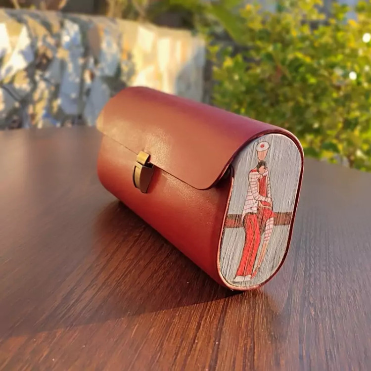 کیف دستی زنانه طرح ملوان چرم طبیعی گاوی درجه یک تماما دستدوز است که در کناره کیف از چوب نراد طراحی شده توسط تیم چرم خلاق استفاده شده که روی چوب ها نقاشی دست با رنگ آکرولیک کار شده و تمامی چوب ها دارای پوشش نانو ضد آب و خش است.