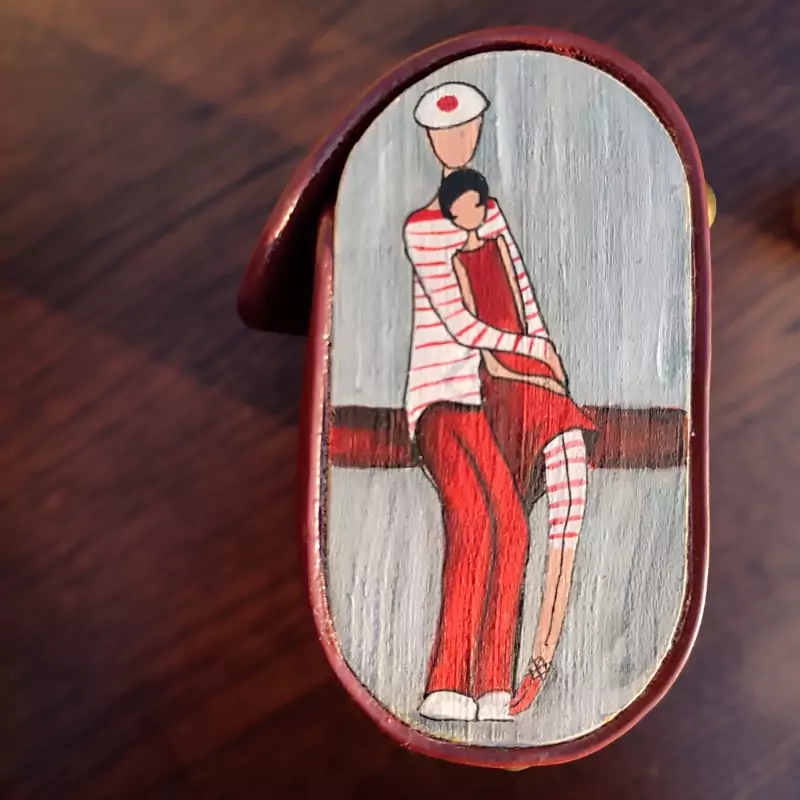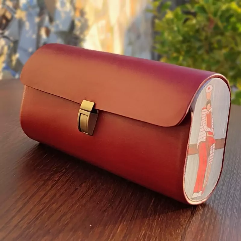 کیف دستی زنانه طرح ملوان چرم طبیعی گاوی درجه یک تماما دستدوز است که در کناره کیف از چوب نراد طراحی شده توسط تیم چرم خلاق استفاده شده که روی چوب ها نقاشی دست با رنگ آکرولیک کار شده و تمامی چوب ها دارای پوشش نانو ضد آب و خش است.