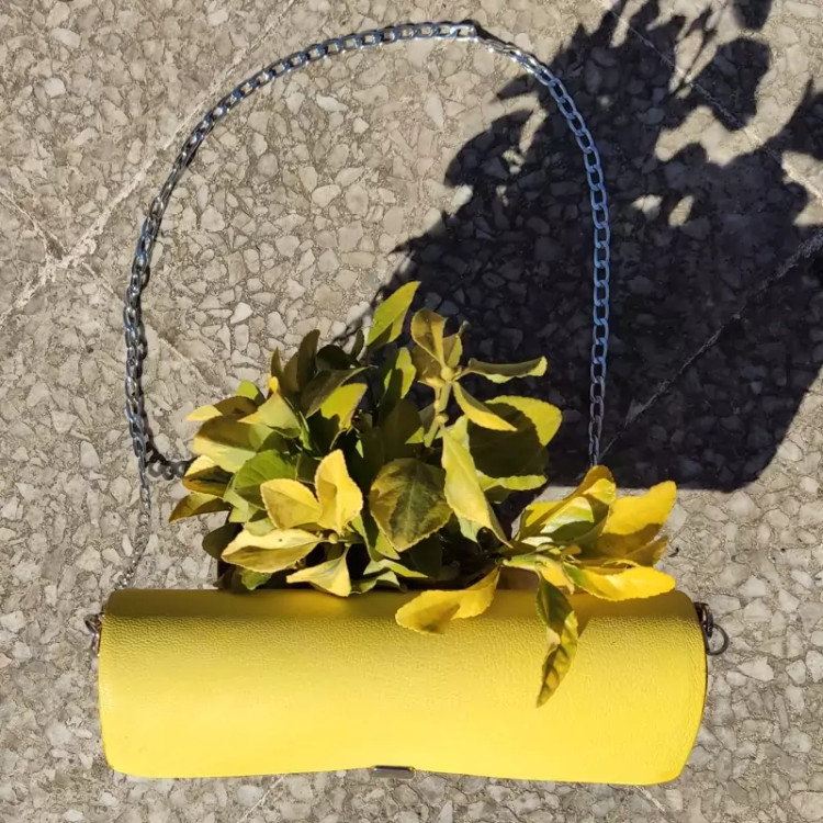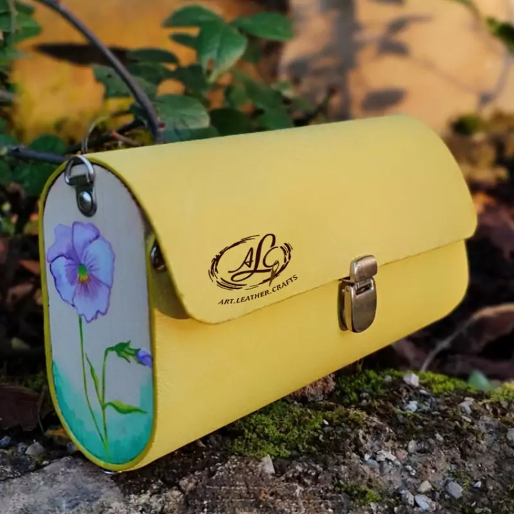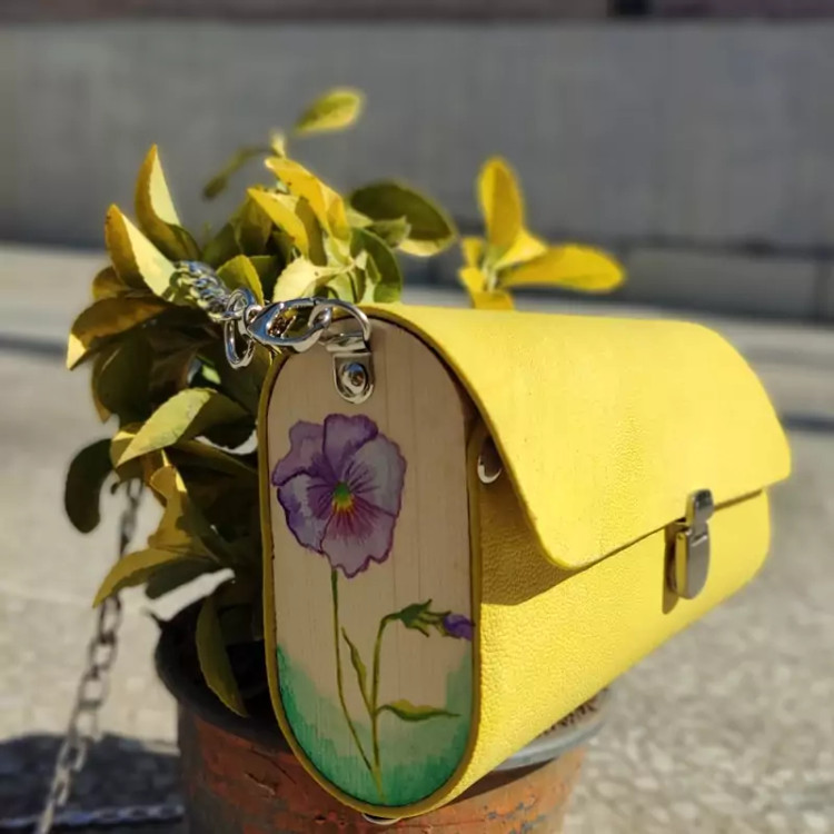 کیف دستی زنانه طرح گل بنفشه دارای بند بلند برای استفاده رودوشی چرم طبیعی بز درجه یک تماما دستدوز است که در کناره کیف از چوب نراد طراحی شده توسط تیم چرم خلاق استفاده شده که روی چوب ها نقاشی دست با رنگ آکرولیک کار شده و تمامی چوب ها دارای پوشش نانو ضد آب و خش است.