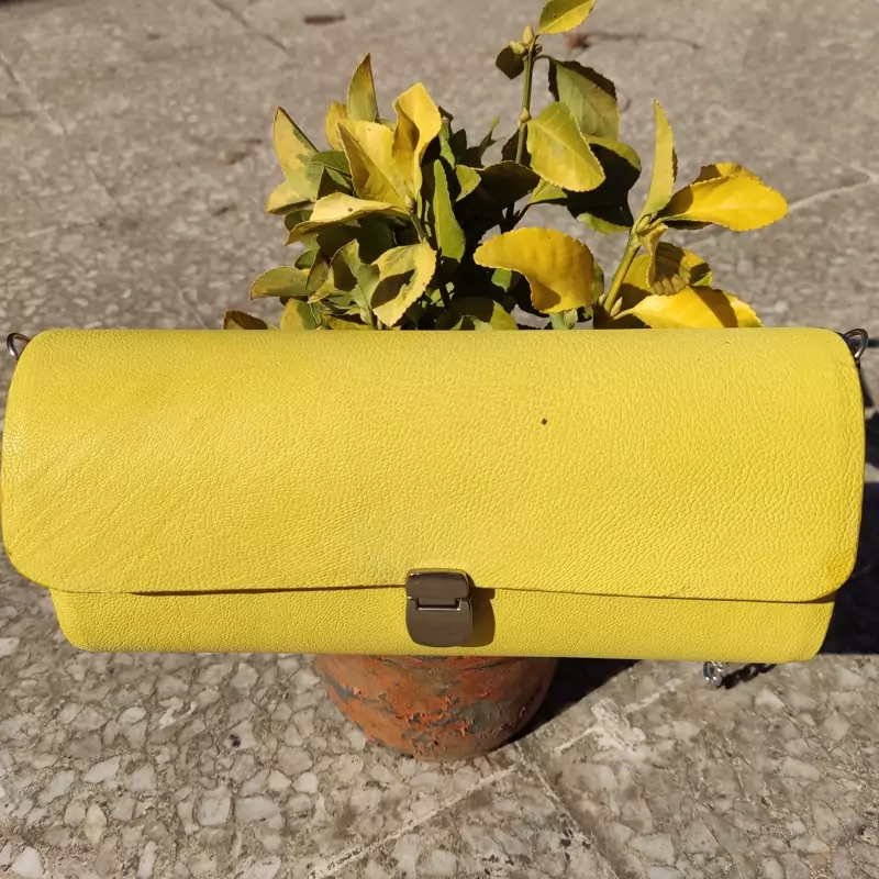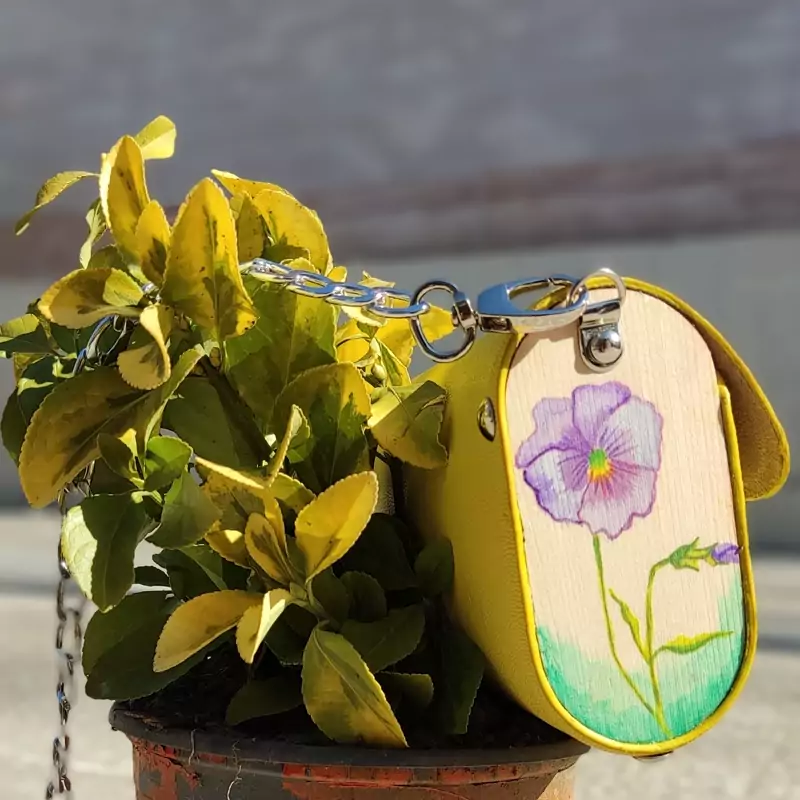 کیف دستی زنانه طرح گل بنفشه دارای بند بلند برای استفاده رودوشی چرم طبیعی بز درجه یک تماما دستدوز است که در کناره کیف از چوب نراد طراحی شده توسط تیم چرم خلاق استفاده شده که روی چوب ها نقاشی دست با رنگ آکرولیک کار شده و تمامی چوب ها دارای پوشش نانو ضد آب و خش است.