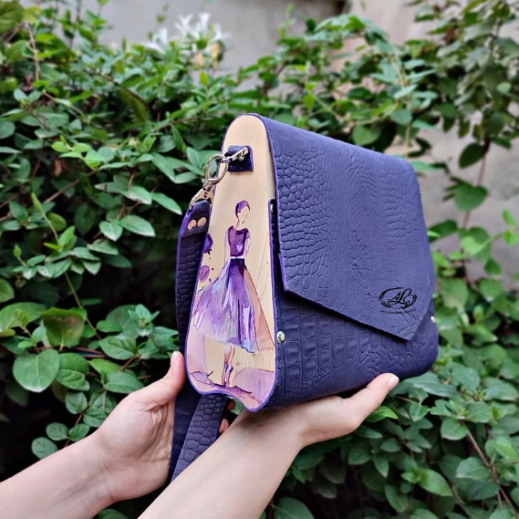 کیف رودوشی زنانه طرح دختر آبرنگی چرم طبیعی گاوی درجه یک تماما دستدوز است که در کناره کیف از چوب نراد طراحی شده توسط تیم چرم خلاق استفاده شده که روی چوب ها نقاشی دست با رنگ آکرولیک کار شده و تمامی چوب ها دارای پوشش نانو ضد آب و خش است.