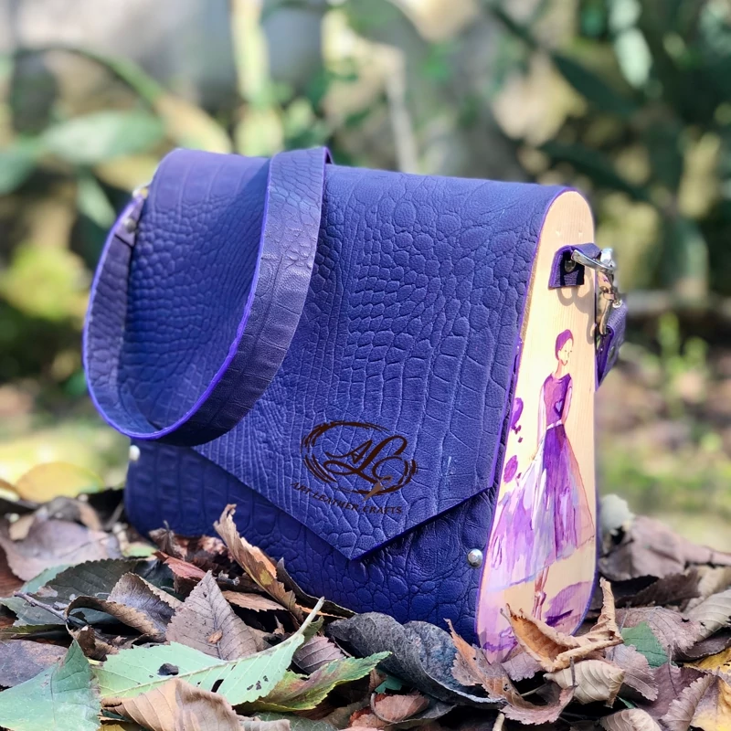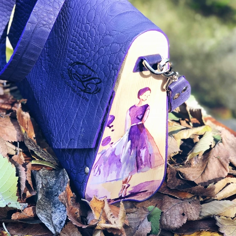 کیف رودوشی زنانه طرح دختر آبرنگی چرم طبیعی گاوی درجه یک تماما دستدوز است که در کناره کیف از چوب نراد طراحی شده توسط تیم چرم خلاق استفاده شده که روی چوب ها نقاشی دست با رنگ آکرولیک کار شده و تمامی چوب ها دارای پوشش نانو ضد آب و خش است.