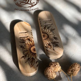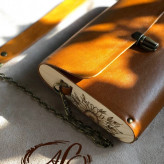 کیف رودوشی زنانه طرح آفتابگردان چرم طبیعی گاوی درجه یک تماما دستدوز است که در کناره کیف از چوب نراد طراحی شده توسط تیم چرم خلاق استفاده شده که روی چوب های آن سوخته نگاری میباشد و تمامی چوب ها دارای پوشش نانو ضد آب و خش است.