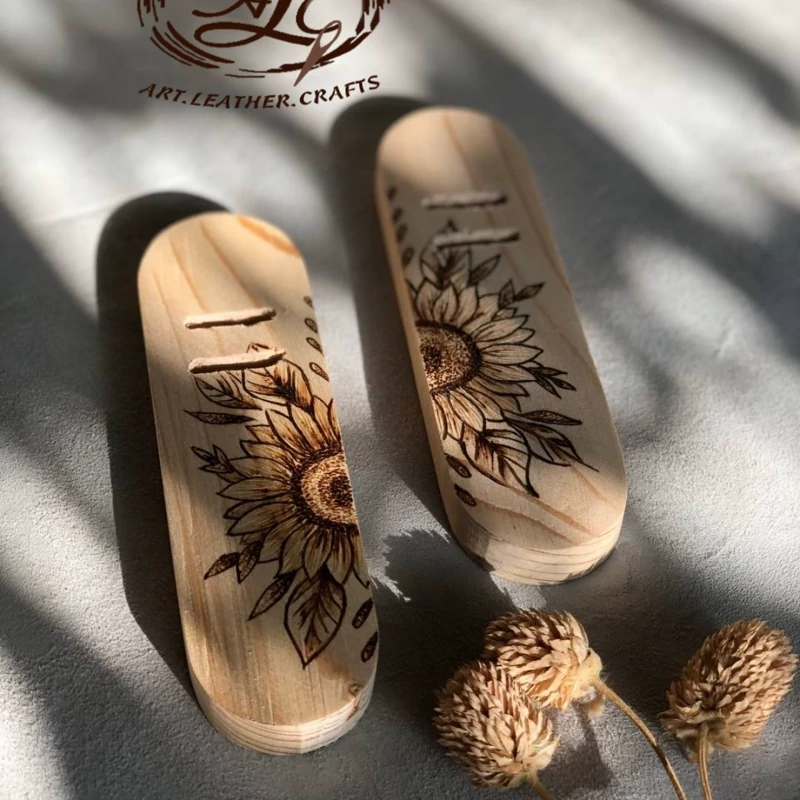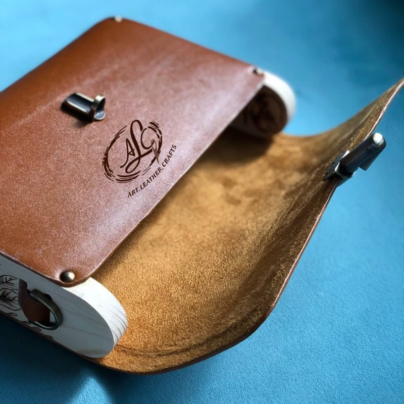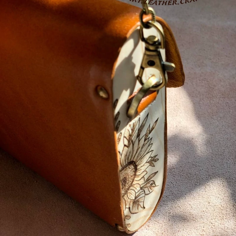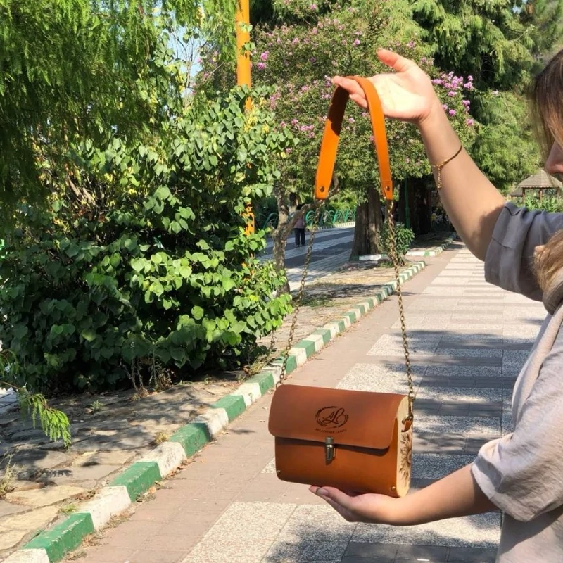 کیف رودوشی زنانه طرح آفتابگردان چرم طبیعی گاوی درجه یک تماما دستدوز است که در کناره کیف از چوب نراد طراحی شده توسط تیم چرم خلاق استفاده شده که روی چوب های آن سوخته نگاری میباشد و تمامی چوب ها دارای پوشش نانو ضد آب و خش است.
