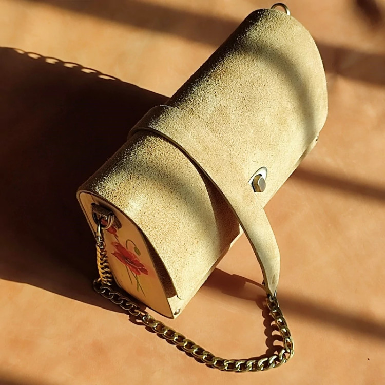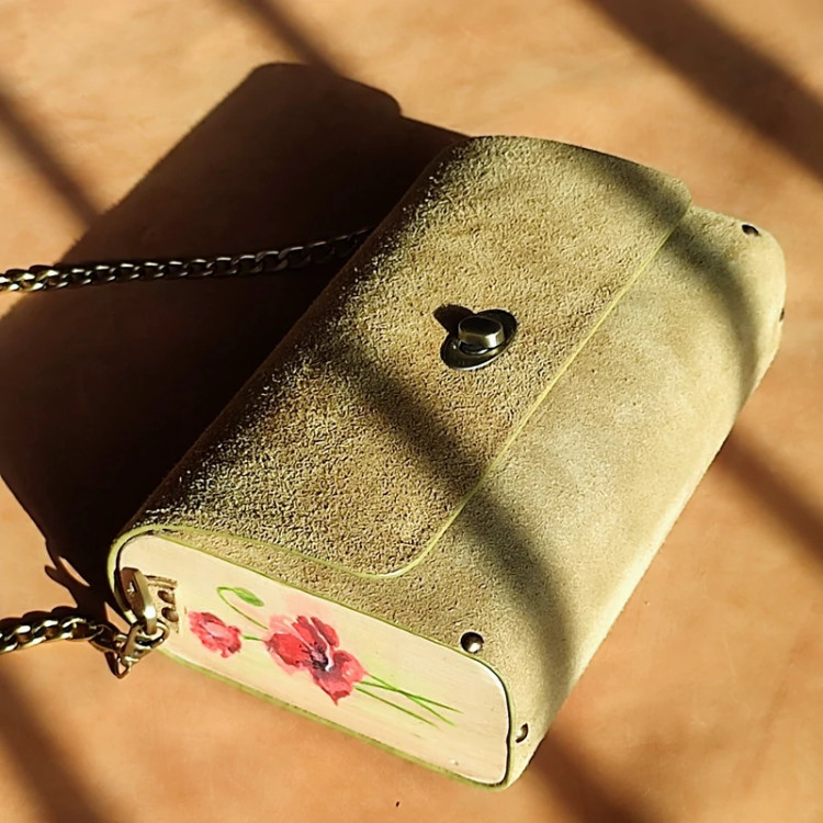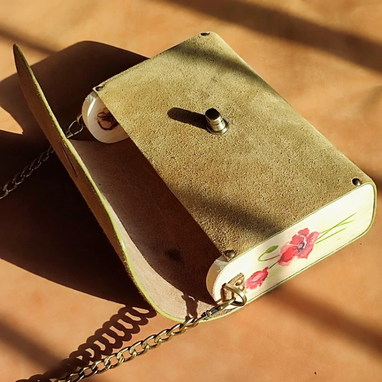 کیف رودوشی زنانه طرح شقایق چرم طبیعی اشبالت گاوی درجه یک تماما دستدوز است که در کناره کیف از چوب نراد طراحی شده توسط تیم چرم خلاق استفاده شده که روی چوب ها نقاشی دست با رنگ آکرولیک کار شده و تمامی چوب ها داری مواد نانو ضد آب و خش است