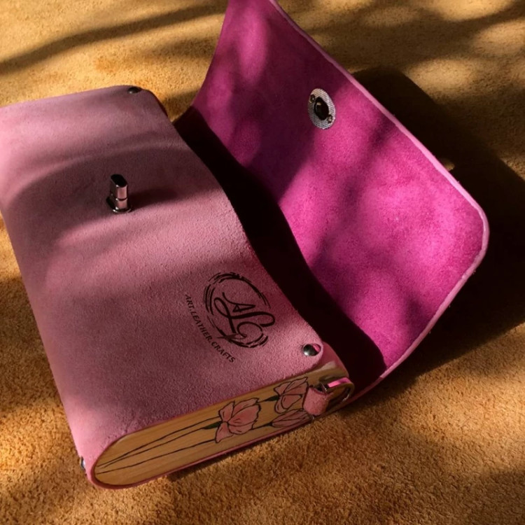کیف دستی زنانه طرح گل زینتی با قابلیت اضافه کردن بند رودوشی چرم طبیعی گاوی درجه یک تماما دستدوز است که در کناره کیف از چوب نراد طراحی شده توسط تیم چرم خلاق استفاده شده که روی چوب ها نقاشی دست با رنگ آکرولیک کار شده و تمامی چوب ها دارای پوشش نانو ضد آب و خش است.
