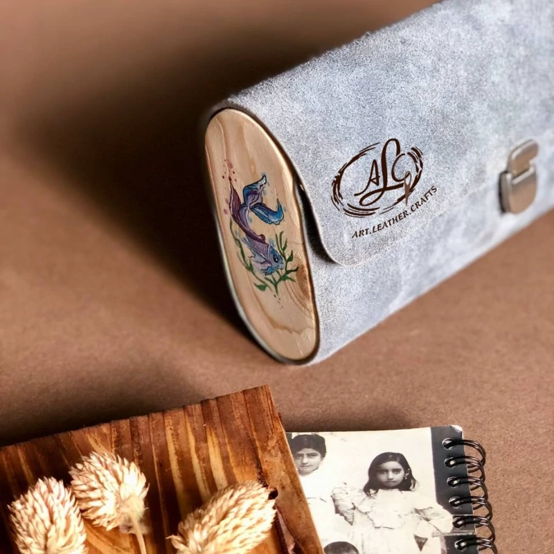 کیف دستی زنانه طرح ماهی با قابلیت اضافه کردن بند رودوشی چرم طبیعی گاوی درجه یک تماما دستدوز است که در کناره کیف از چوب نراد طراحی شده توسط تیم چرم خلاق استفاده شده که روی چوب ها نقاشی دست با رنگ آکرولیک کار شده و تمامی چوب ها دارای پوشش نانو ضد آب و خش است.