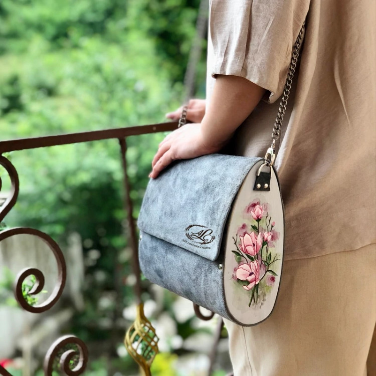 کیف رودوشی زنانه طرح گل آلاله چرم طبیعی گاوی درجه یک تماما دستدوز است که در کناره کیف از چوب نراد طراحی شده توسط تیم چرم خلاق استفاده شده که روی چوب ها نقاشی دست با رنگ آکرولیک کار شده و تمامی چوب ها دارای پوشش نانو ضد آب و خش است.