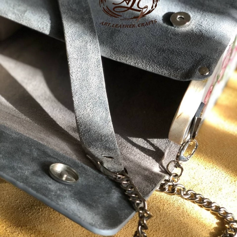 کیف رودوشی زنانه طرح گل آلاله چرم طبیعی گاوی درجه یک تماما دستدوز است که در کناره کیف از چوب نراد طراحی شده توسط تیم چرم خلاق استفاده شده که روی چوب ها نقاشی دست با رنگ آکرولیک کار شده و تمامی چوب ها دارای پوشش نانو ضد آب و خش است.