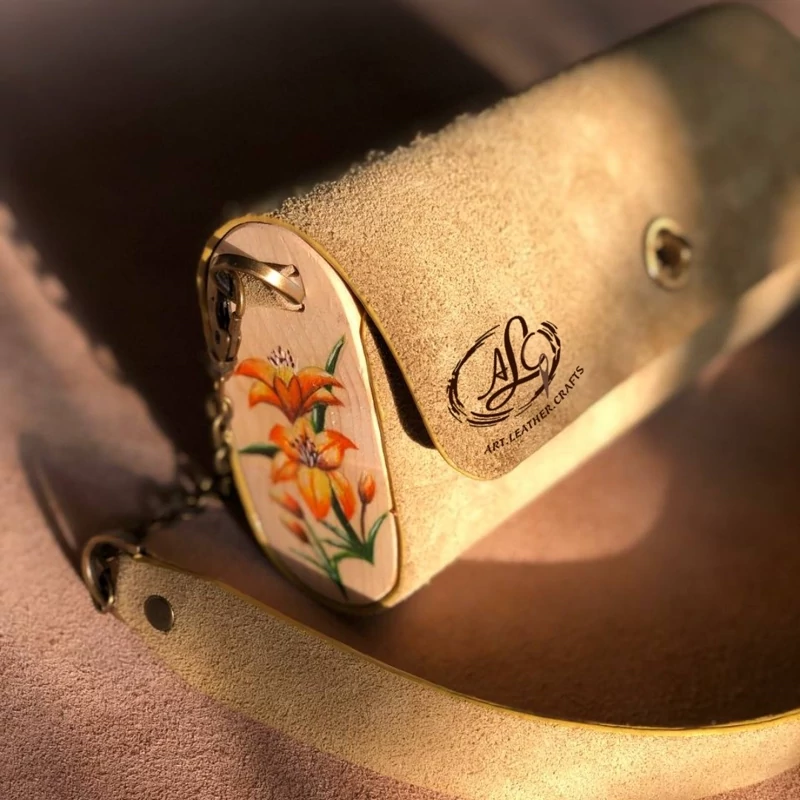 کیف دستی زنانه طرح زنبق با قابلیت اضافه کردن بند رودوشی چرم طبیعی گاوی درجه یک تماما دستدوز است که در کناره کیف از چوب نراد طراحی شده توسط تیم چرم خلاق استفاده شده که روی چوب ها نقاشی دست با رنگ آکرولیک کار شده و تمامی چوب ها دارای پوشش نانو ضد آب و خش است.