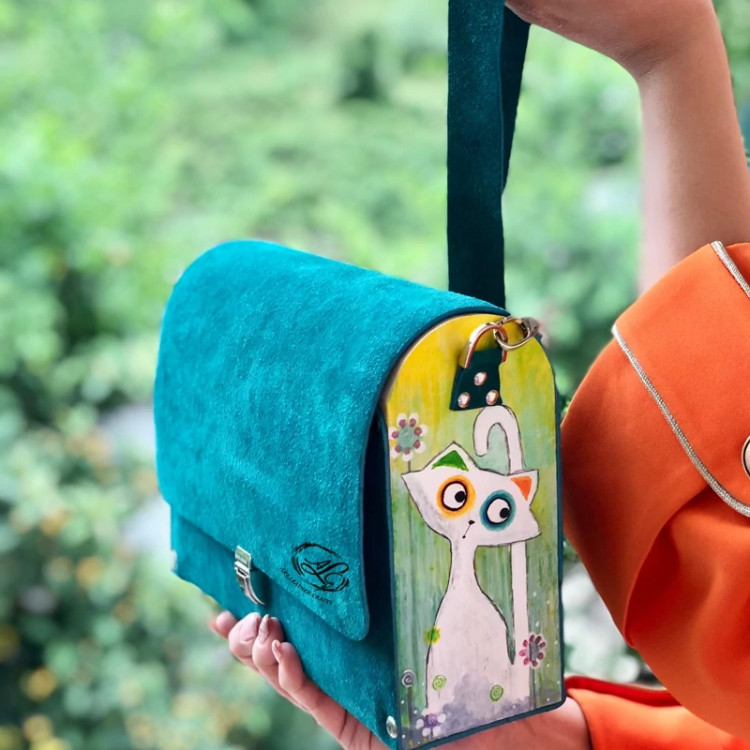 کیف رودوشی زنانه طرح گربه گرافیکی چرم طبیعی گاوی درجه یک تماما دستدوز است که در کناره کیف از چوب نراد طراحی شده توسط تیم چرم خلاق استفاده شده که روی چوب ها نقاشی دست با رنگ آکرولیک کار شده و تمامی چوب ها دارای پوشش نانو ضد آب و خش است.