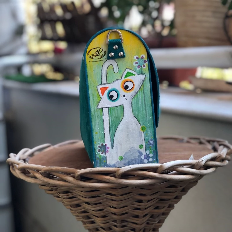 کیف رودوشی زنانه طرح گربه گرافیکی چرم طبیعی گاوی درجه یک تماما دستدوز است که در کناره کیف از چوب نراد طراحی شده توسط تیم چرم خلاق استفاده شده که روی چوب ها نقاشی دست با رنگ آکرولیک کار شده و تمامی چوب ها دارای پوشش نانو ضد آب و خش است.