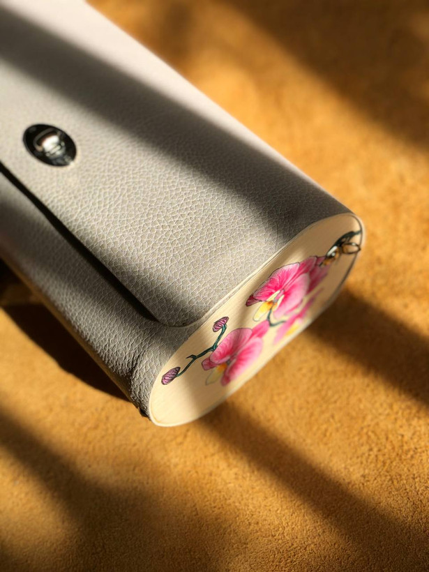 کیف رودوشی زنانه طرح ارکیده چرم طبیعی گاوی درجه یک تماما دستدوز است که در کناره کیف از چوب نراد طراحی شده توسط تیم چرم خلاق استفاده شده که روی چوب ها نقاشی دست با رنگ آکرولیک کار شده و تمامی چوب ها دارای پوشش نانو ضد آب و خش است.