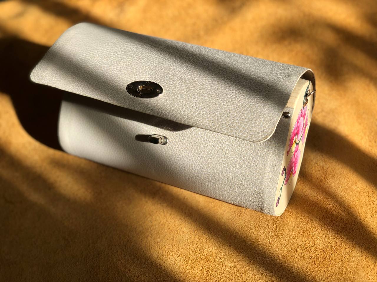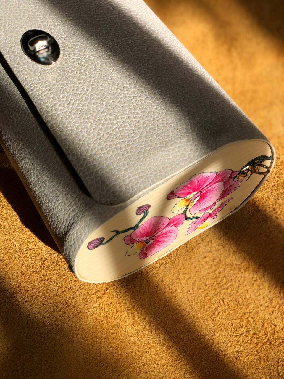 کیف رودوشی زنانه طرح ارکیده چرم طبیعی گاوی درجه یک تماما دستدوز است که در کناره کیف از چوب نراد طراحی شده توسط تیم چرم خلاق استفاده شده که روی چوب ها نقاشی دست با رنگ آکرولیک کار شده و تمامی چوب ها دارای پوشش نانو ضد آب و خش است.