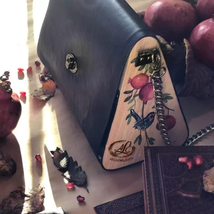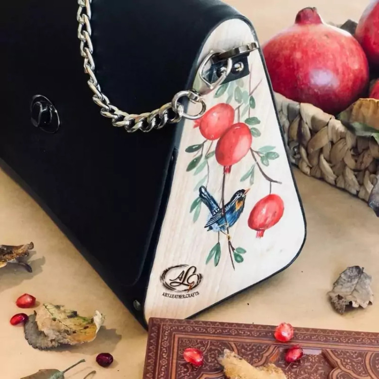 کیف رودوشی زنانه طرح گل انار چرم طبیعی گاوی درجه یک تماما دستدوز است که در کناره کیف از چوب نراد طراحی شده توسط تیم چرم خلاق استفاده شده که روی چوب ها نقاشی دست با رنگ آکرولیک کار شده و تمامی چوب ها دارای پوشش نانو ضد آب و خش است.