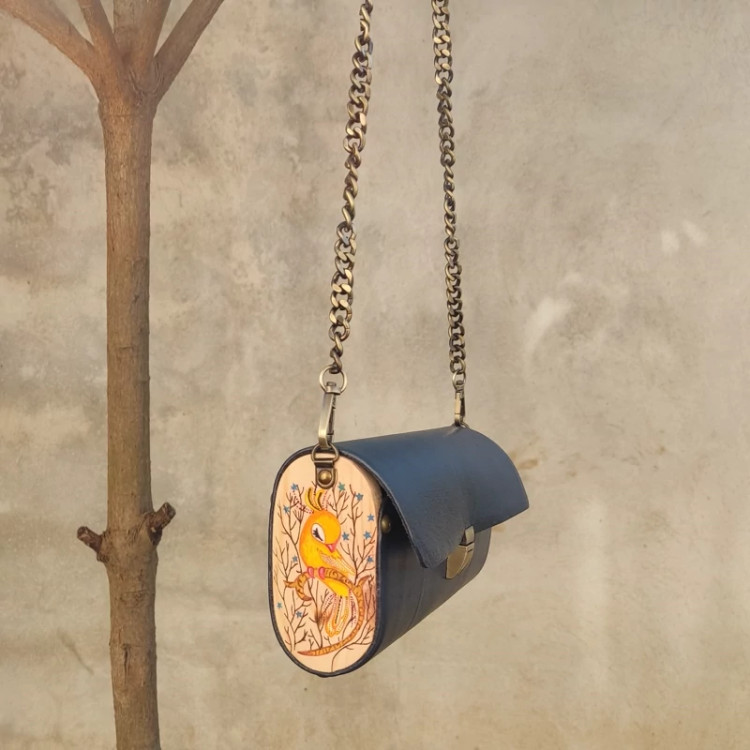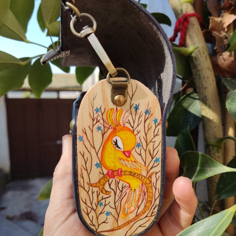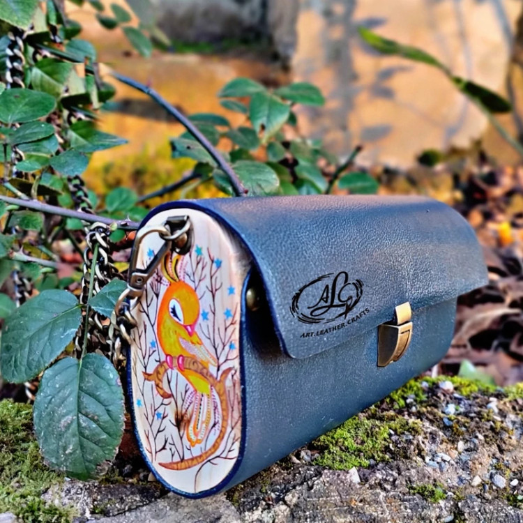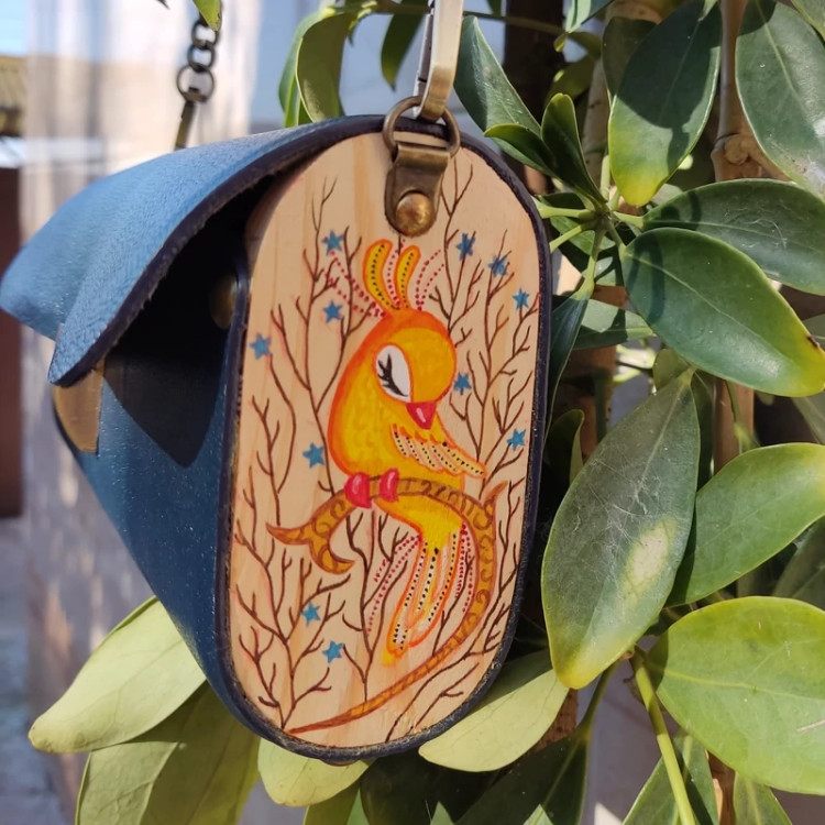 کیف دستی زنانه طرح گنجشک سربا قابلیت اضافه کردن بند رودوشی چرم طبیعی گاوی درجه یک تماما دستدوز است که در کناره کیف از چوب نراد طراحی شده توسط تیم چرم خلاق استفاده شده که روی چوب ها نقاشی دست با رنگ آکرولیک کار شده و تمامی چوب ها دارای پوشش نانو ضد آب و خش است.