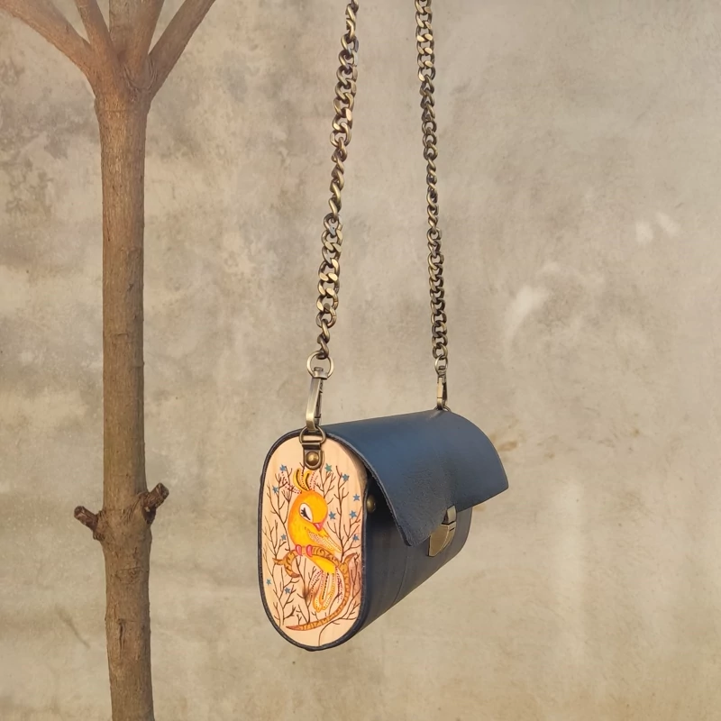کیف دستی زنانه طرح گنجشک سربا قابلیت اضافه کردن بند رودوشی چرم طبیعی گاوی درجه یک تماما دستدوز است که در کناره کیف از چوب نراد طراحی شده توسط تیم چرم خلاق استفاده شده که روی چوب ها نقاشی دست با رنگ آکرولیک کار شده و تمامی چوب ها دارای پوشش نانو ضد آب و خش است.