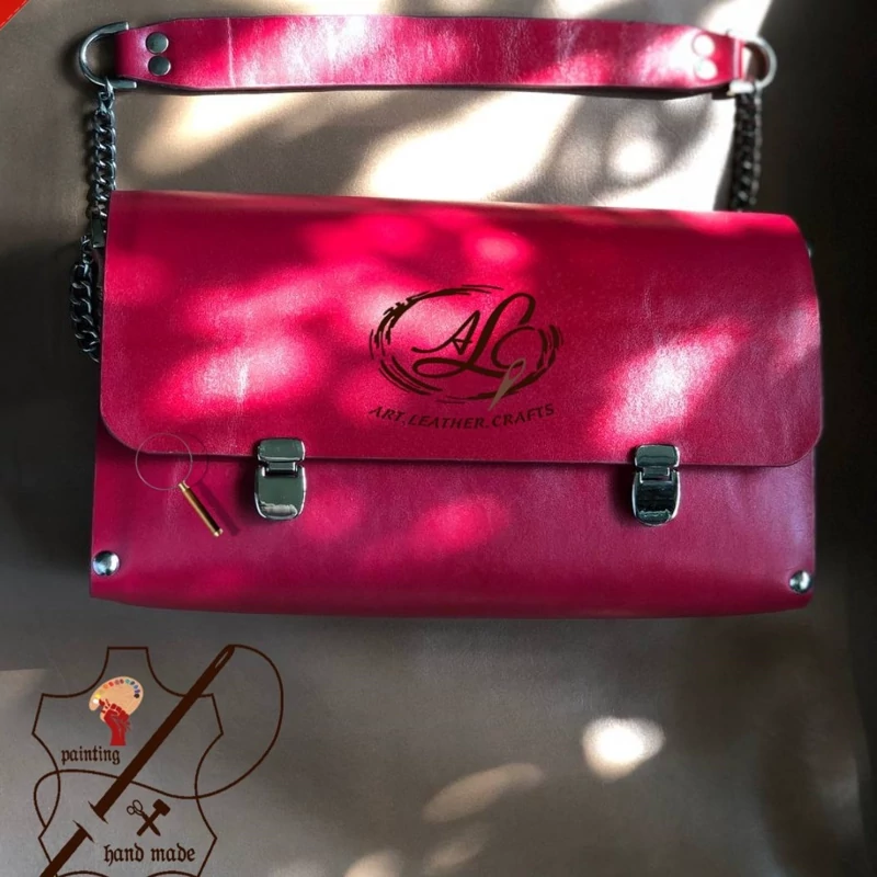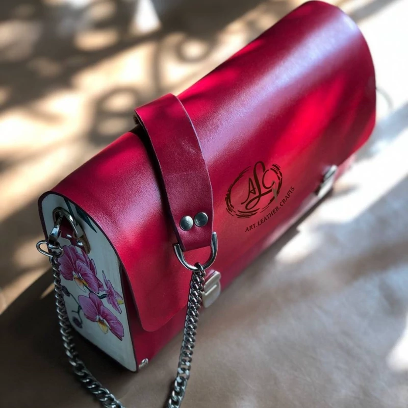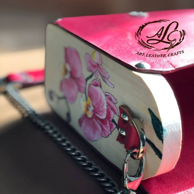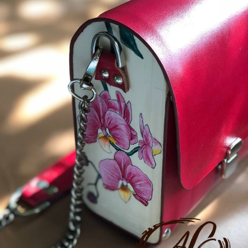 کیف رودوشی زنانه طرح ارکیده چرم طبیعی گاوی درجه یک تماما دستدوز است که در کناره کیف از چوب نراد طراحی شده توسط تیم چرم خلاق استفاده شده که روی چوب ها نقاشی دست با رنگ آکرولیک کار شده و تمامی چوب ها دارای پوشش نانو ضد آب و خش است.