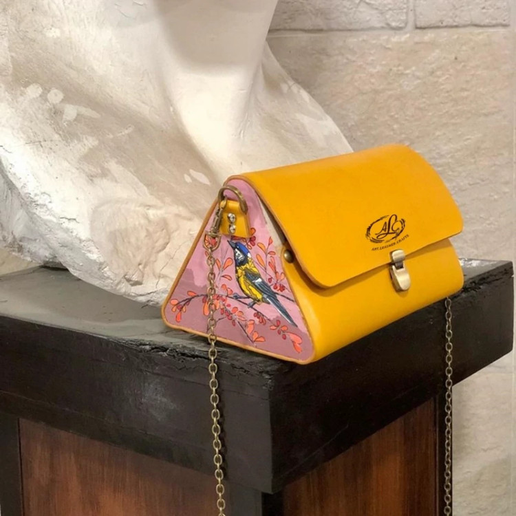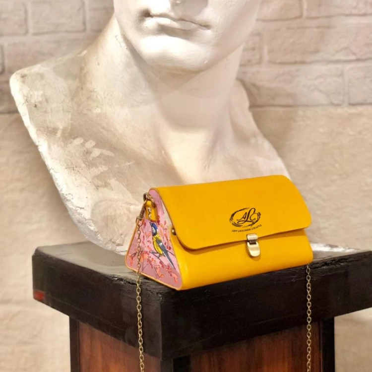 کیف رودوشی زنانه طرح گنجشک چرم طبیعی گاوی درجه یک تماما دستدوز است که در کناره کیف از چوب نراد طراحی شده توسط تیم چرم خلاق استفاده شده که روی چوب ها نقاشی دست با رنگ آکرولیک کار شده و تمامی چوب ها دارای پوشش نانو ضد آب و خش است.