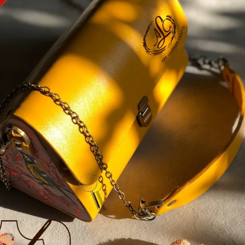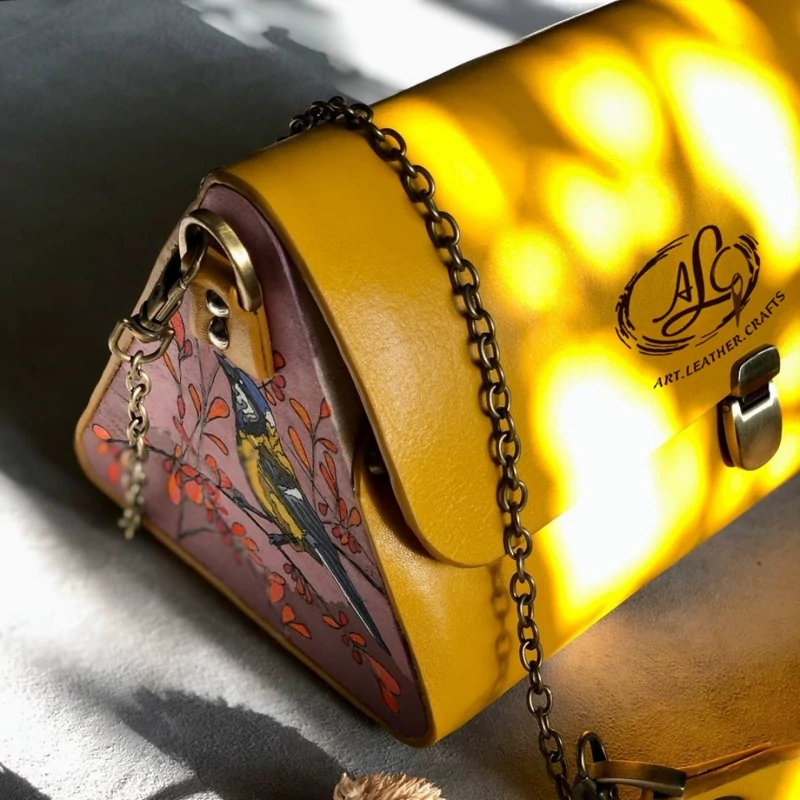 کیف رودوشی زنانه طرح گنجشک چرم طبیعی گاوی درجه یک تماما دستدوز است که در کناره کیف از چوب نراد طراحی شده توسط تیم چرم خلاق استفاده شده که روی چوب ها نقاشی دست با رنگ آکرولیک کار شده و تمامی چوب ها دارای پوشش نانو ضد آب و خش است.