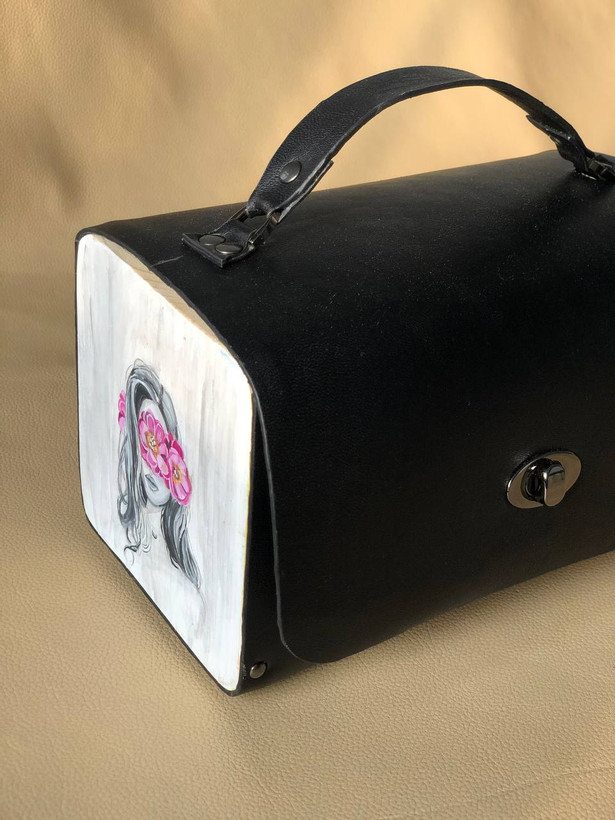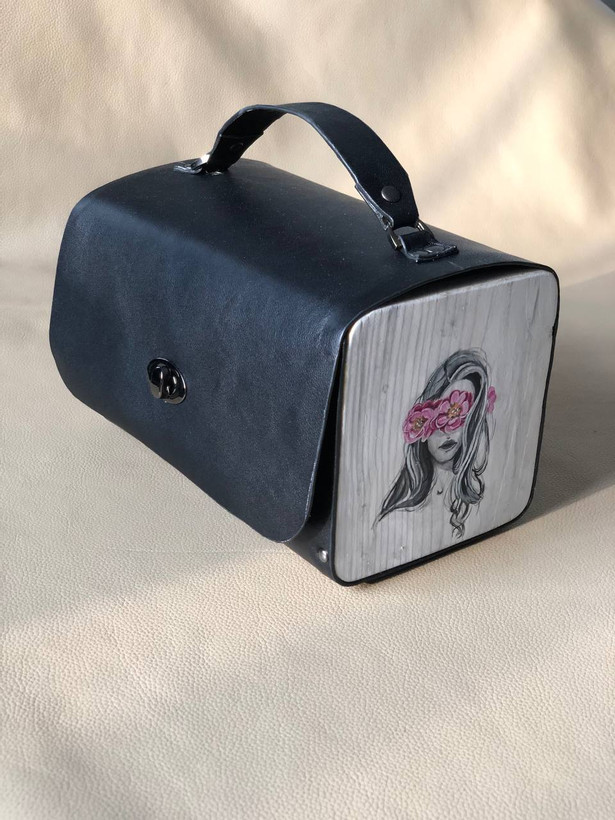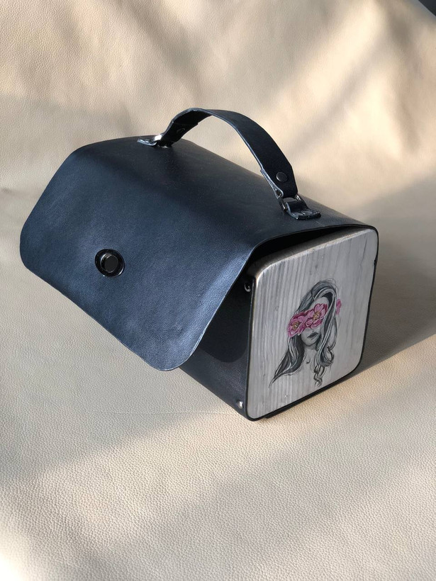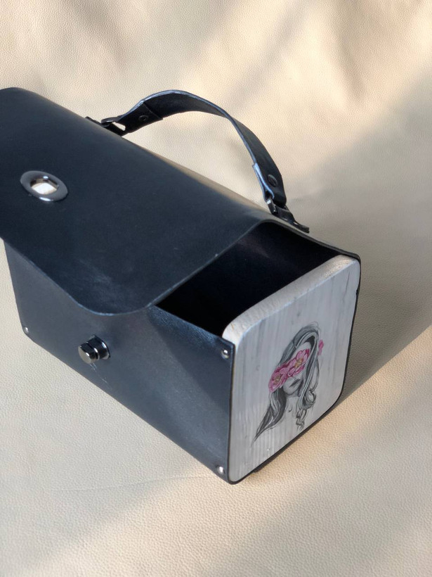 کیف دستی زنانه طرح گل به سر با قابلیت اضافه کردن بند رودوشی چرم طبیعی گاوی درجه یک تماما دستدوز است که در کناره کیف از چوب نراد طراحی شده توسط تیم چرم خلاق استفاده شده که روی چوب ها نقاشی دست با رنگ آکرولیک کار شده و تمامی چوب ها دارای پوشش نانو ضد آب و خش است.