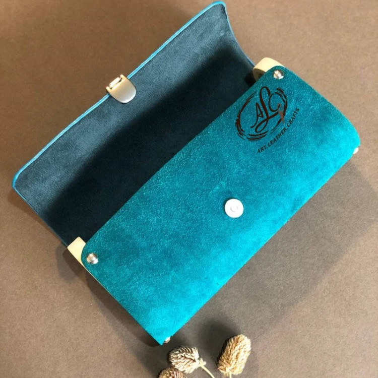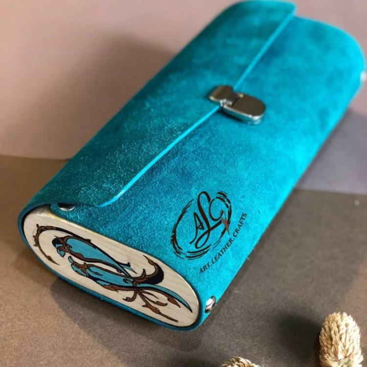 کیف دستی زنانه طرح مرغ فیروز با قابلیت اضافه کردن بند رودوشی چرم طبیعی گاوی درجه یک تماما دستدوز است که در کناره کیف از چوب نراد طراحی شده توسط تیم چرم خلاق استفاده شده که روی چوب ها نقاشی دست با رنگ آکرولیک کار شده و تمامی چوب ها دارای پوشش نانو ضد آب و خش است.