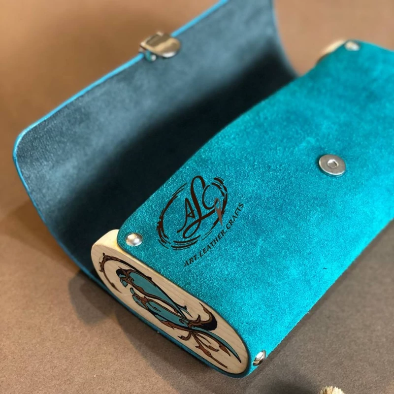 کیف دستی زنانه طرح مرغ فیروز با قابلیت اضافه کردن بند رودوشی چرم طبیعی گاوی درجه یک تماما دستدوز است که در کناره کیف از چوب نراد طراحی شده توسط تیم چرم خلاق استفاده شده که روی چوب ها نقاشی دست با رنگ آکرولیک کار شده و تمامی چوب ها دارای پوشش نانو ضد آب و خش است.