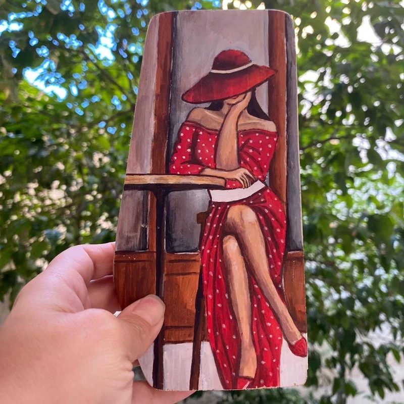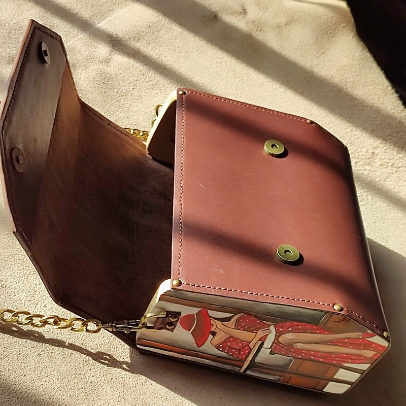 کیف رودوشی زنانه طرح زن اروپایی چرم طبیعی گاوی درجه یک تماما دستدوز است که در کناره کیف از چوب نراد طراحی شده توسط تیم چرم خلاق استفاده شده که روی چوب ها نقاشی دست با رنگ آکرولیک کار شده و تمامی چوب ها دارای پوشش نانو ضد آب و خش است.