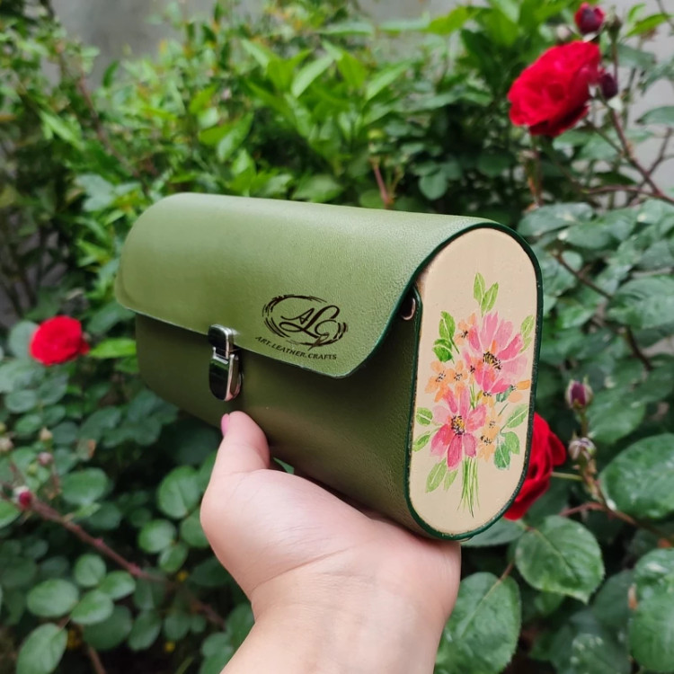 کیف دستی زنانه طرح گلبرگ با قابلیت اضافه کردن بند رودوشی چرم طبیعی گاوی درجه یک تماما دستدوز است که در کناره کیف از چوب نراد طراحی شده توسط تیم چرم خلاق استفاده شده که روی چوب ها نقاشی دست با رنگ آکرولیک کار شده و تمامی چوب ها دارای پوشش نانو ضد آب و خش است.