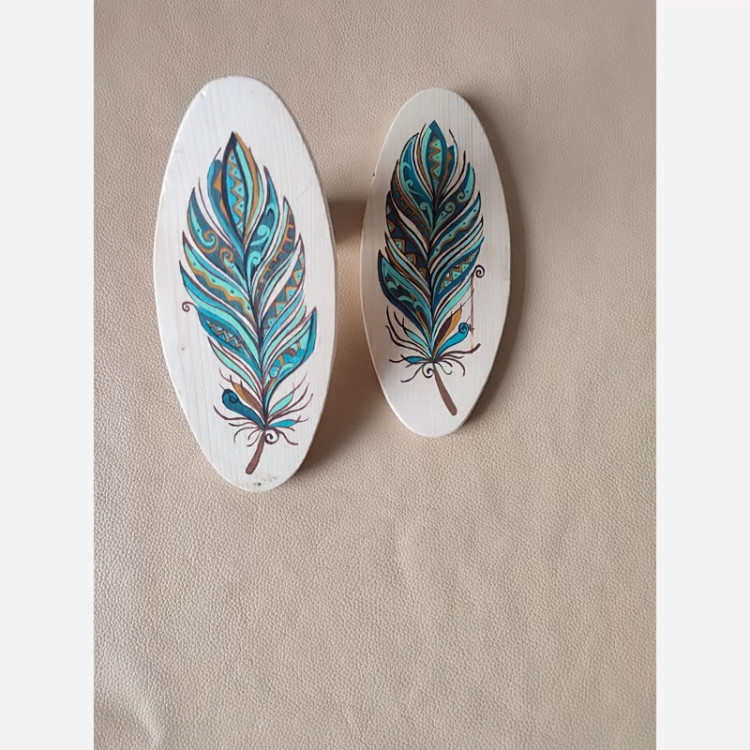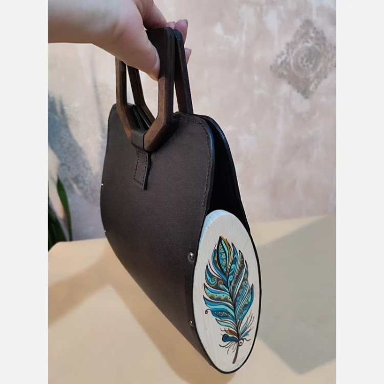کیف دسته چوبی زنانه طرح پر با قابلیت اضافه کردن بند رودوشی چرم طبیعی گاوی درجه یک تماما دستدوز است که در کناره کیف از چوب نراد طراحی شده توسط تیم چرم خلاق استفاده شده که روی چوب ها نقاشی دست با رنگ آکرولیک کار شده و تمامی چوب ها دارای پوشش نانو ضد آب و خش است.