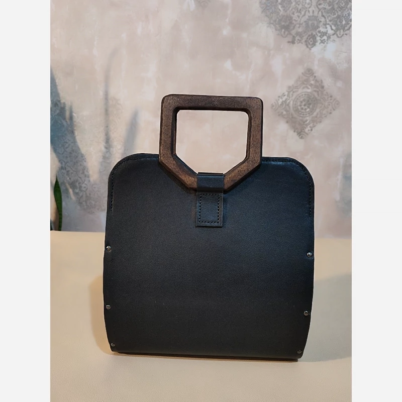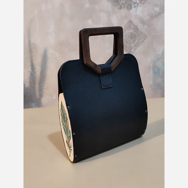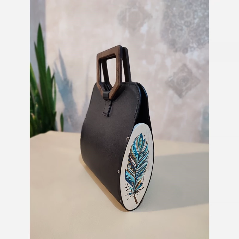 کیف دسته چوبی زنانه طرح پر با قابلیت اضافه کردن بند رودوشی چرم طبیعی گاوی درجه یک تماما دستدوز است که در کناره کیف از چوب نراد طراحی شده توسط تیم چرم خلاق استفاده شده که روی چوب ها نقاشی دست با رنگ آکرولیک کار شده و تمامی چوب ها دارای پوشش نانو ضد آب و خش است.
