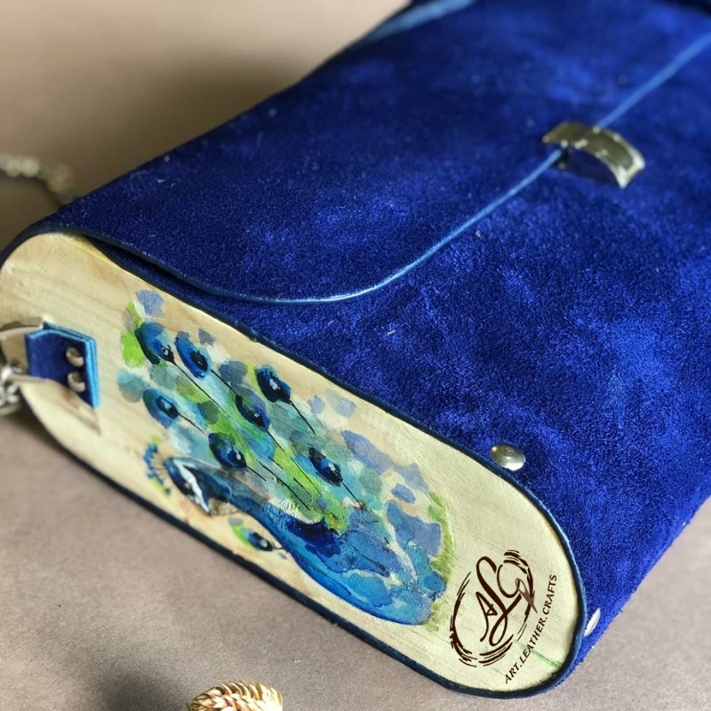 کیف رودوشی طرح طاووس چرم طبیعی گاوی درجه یک تماما دستدوز است که در کناره کیف از چوب نراد طراحی شده توسط تیم چرم خلاق استفاده شده که روی چوب ها نقاشی دست با رنگ آکرولیک کار شده و تمامی چوب ها دارای پوشش نانو ضد آب و خش است.