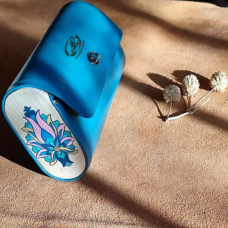 کیف دستی زنانه طرح شاه عباسی با قابلیت اضافه کردن بند رودوشی چرم طبیعی گاوی درجه یک تماما دستدوز است که در کناره کیف از چوب نراد طراحی شده توسط تیم چرم خلاق استفاده شده که روی چوب ها نقاشی دست با رنگ آکرولیک کار شده و تمامی چوب ها دارای پوشش نانو ضد آب و خش است.