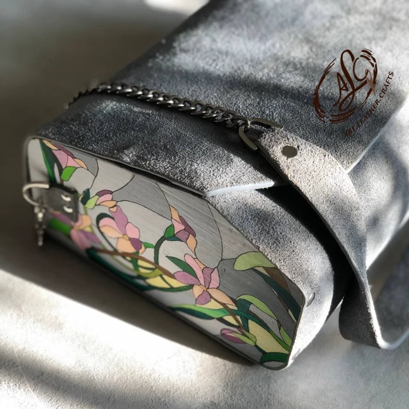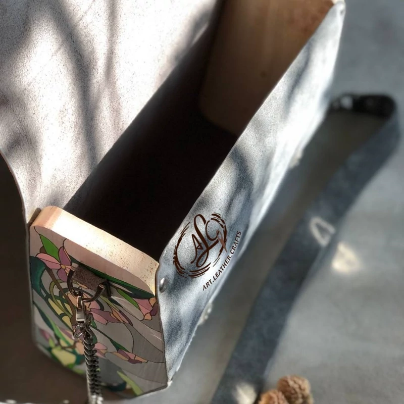 کیف رودوشی چرم طبیعی اشبالت گاوی درجه یک تماما دستدوز است که در کناره کیف از چوب نراد طراحی شده توسط تیم چرم خلاق استفاده شده که روی چوب ها نقاشی دست با رنگ آکرولیک کار شده و تمامی چوب ها دارای پوشش نانو ضد آب و خش است.